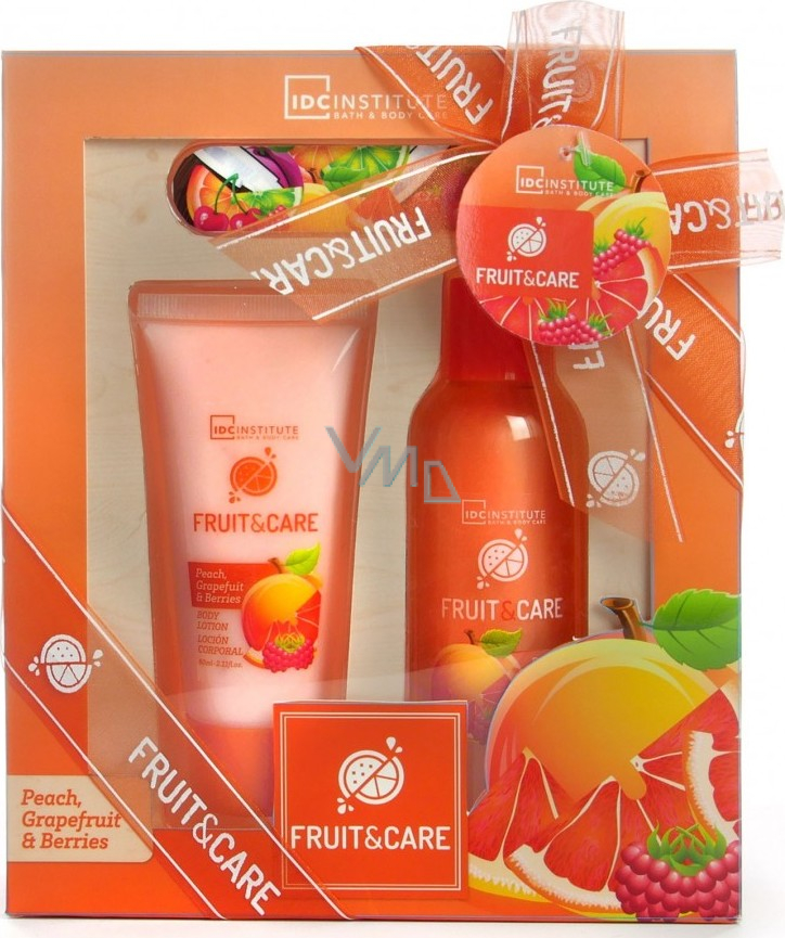 Idc Institute Fruit & Care Peach, Grapefruit & Berries sprchový gel 100 ml + tělové mléko 60 ml + pilník na nehty 1 kus, kosmetická sada