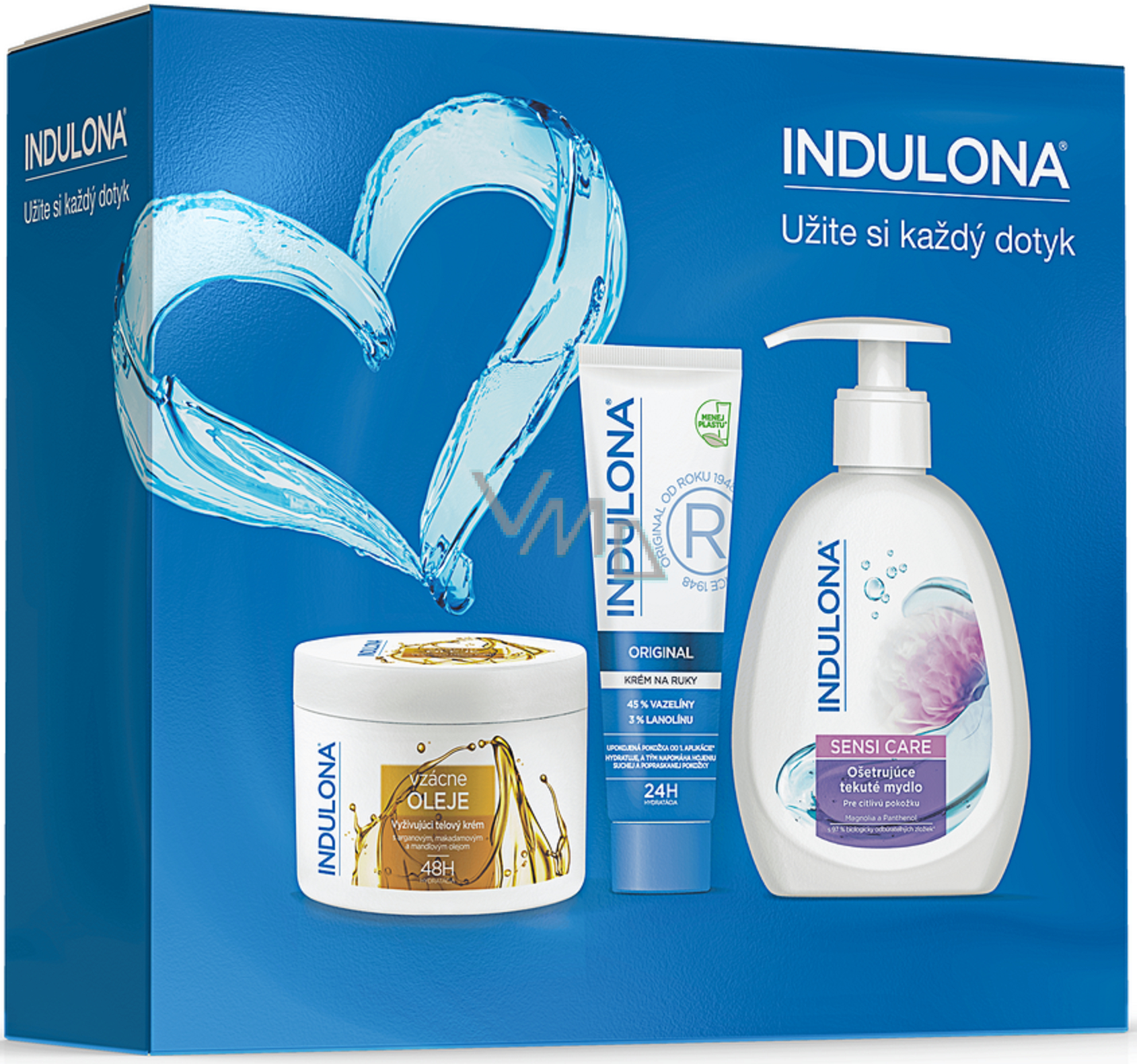 Indulona Original krém na ruce 75 ml + Vzácné oleje vyživující tělový krém pro suchou pokožku 250 ml + Sensi Care tekuté mýdlo pro citlivou pokožku dávkovač 300 ml, kosmetická sada