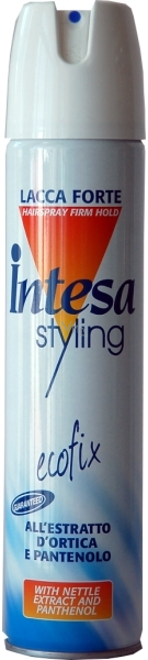Intesa Styling Hair Spray Forte silně tužící lak na vlasy s výtažkem z kopřivy a s panthenolem. Tento kadeřnický lak na vlasy má specialní složení vynalezené k přirozené fixaci jakéhokoli typu účesu, kterému zaručí přirozený tvar a trvenlivost, díky výtažku z kopřivy a panthenolu, které jsou základními produkty v péči o vlasové vlákno. Respektuje přirozenost vlasů a aniž by je vysušil zanechává vlasy hedvábné a lesklé. Snižuje maštění vlasů. Lehce vyčesatelný hřebenem.