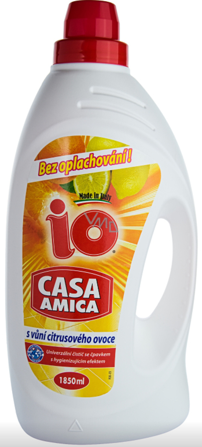 IO CASA AMica o zapachu owoców cytrusowych - Uniwersalny i wysoce skuteczny płyn do mycia z działaniem higienizującym, który możesz wykorzystać do czyszczenia całego domu. Czyści i odtłuszcza wszystkie rodzaje powierzchni domowych. Dzięki zawartości odplamiacza i alkoholu powierzchnie szybko schną i pozostają bez smug.