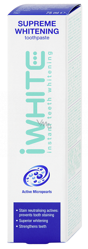 iWhite bělící zubní pasta Supreme Whitening působí na povrch zubu a zubní skvrny díky svému aktivnímu bělícímu systému, který je vhodný pro každodenní použití. Kombinujte pastu se zubním kartáčkem iWhite Instant a iWhite Instant sadou na bělení zubů pro dlouhotrvající bělící výsledek a zářivě bílý úsměv!