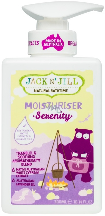 Serenity je zklidňující jedinečná směs aromaterapie od Jack N 'Jill s extraktem z australského bílého cypřiše, levandulovým olejem, olejem z šalvěje muškátové a heřmánkovým olejem. Přírodní tělové mléko obsahuje přírodní výtažky a hydratační přísady, které vytvářejí obohacující a hydratační složení. Tento lehký hydratační přípravek je určen především pro dětskou citlivou pleť. Přípravek je bohatý na nejrůznější přísady, jako je alantoin, glycerin a panthenol, které pracují společně a zanechávají pokožku velmi měkkou a hluboce hydratovanou.