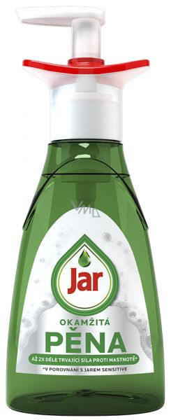 Čistič na nádobí Jar Active Foam o objemu 350 ml je čisticí prostředek určený pro ruční mytí nádobí. Vyniká revoluční technologií - okamžitou pěnou. Není nutné houbičku namáčet a mačkat, aby vznikla pěna, stačí Jar nanést rovnou na houbičku a ihned mýt. Samozřejmě nechybí tradiční vlastnost Jaru, silné mycí a odmašťovací schopnosti, které nádobí účinně zbaví mastnoty a veškerých nečistot a zanechají je zářivě čisté a dokonale odmaštěné. Tekutý prostředek Jar Active Foam je jemný a šetrný k vaší pokožce.