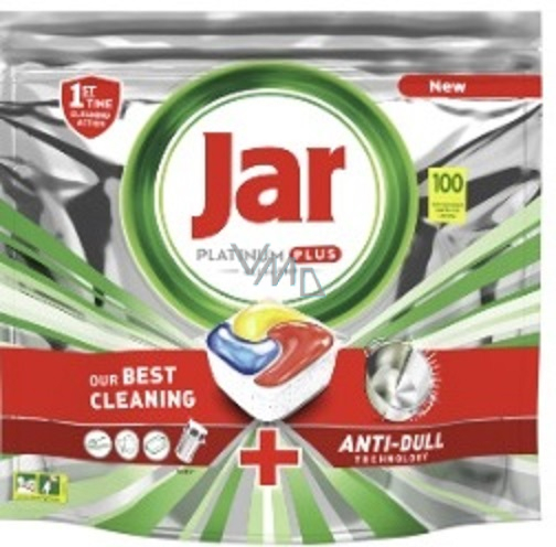Kapsle Jar Platinum Plus Vše v jednom do automatické myčky nádobí zanechávají nádobí čisté jako nové, zaručují nejlepší čisticí účinky od Jaru a dokonce pomáhají odstraňovat zašedlost vznikající časem a obnovují původní lesk nádobí. Kapsle Jar Platinum Plus mají zabudovaný systém předmývání, takže nádobí nemusíte předmývat sami. S kapslemi Jar Platinum Plus nebudete muset nádobí předmývat, ušetříte více vody a budete šetrnější k životnímu prostředí. Jar spojuje v jedné účinné kapsli tekutý i práškový prostředek na mytí nádobí. Vysoce rozpustný obal se rychle rozpouští a funguje dobře i při krátkých cyklech, takže nádobí se začíná ihned umývat. A navíc se kapsle tak snadno používají. Kapsli není třeba rozbalovat a stačí ji jen vložit do dávkovacího zásobníku na mycí prostředek.