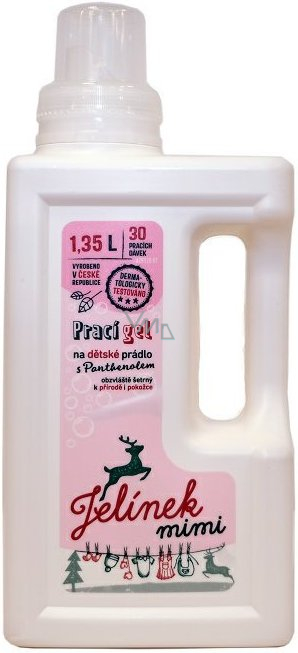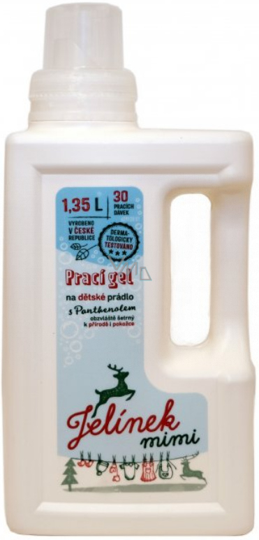 Šetrné prací prostředky jsou klíčové při praní dětského prádla. Dopřejte pokožce svých nejmenších tu nejjemnější péči s pracím gelem Jelínek Mimi s Panthenolem od tradičního českého výrobce Jelen. Jelínkův prací gel byl klinickým testováním vyhodnocen jako mimořádně vhodný na praní prádla miminek. Prací prostředek s obsahem panthenolu prádlo kvalitně vypere, aniž by dráždil citlivou dětskou pokožku. Aby byla dodržena co nejvyšší úroveň šetrnosti k pokožce a přírodě, neobsahuje Jelínek Mimi parfém, konzervanty ani barviva. Jelínkův gel zanechává dětské prádlo čisté a svěží.