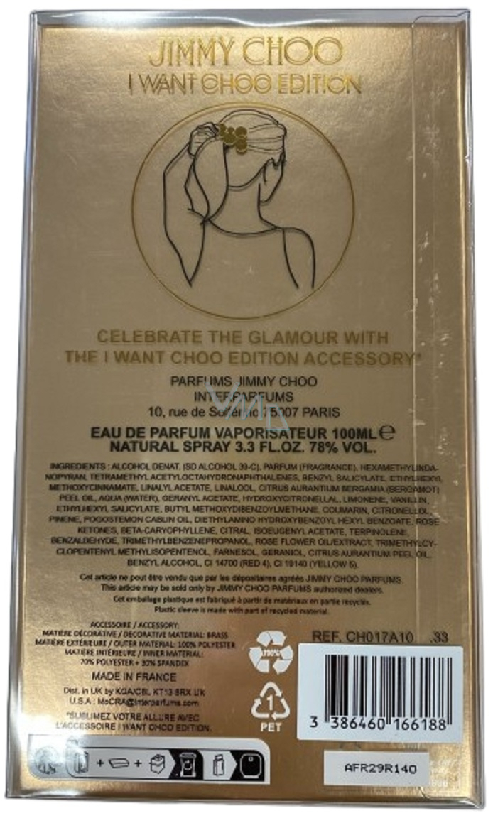 Eau de Parfum „I Want Choo“ od značky Jimmy Choo je stvořená pro večerní párty a slavnostní okamžiky. Tato radostná a energická vůně kombinuje orientální a květinové tóny s jemnými sametovými Broskvovými akordy a kontrastuje je s horními citrusovými tóny. Srdce parfému odhaluje fascinující červenou pavoučí lilii spojenou s Vanilkou a Jasmínem sambac, která dodává vůni svůdný a odvážný charakter. Základní tóny Vanilky a Benzoinu propůjčují kompozici hloubku, eleganci a slavnostní nádech.