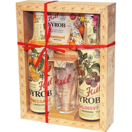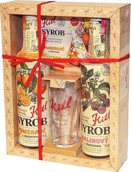Dárkové balení ovocných Kitl Syrobů. Poctivé sirupy pro přípravu tradičních domácích limonád. Kitl Syrob Malinový a Pomerančový s dužninou jsou vhodné především pro přípravu osvěžujících domácích koktejlů a limonád. Balení navíc obsahuje sklenici 200 ml.
