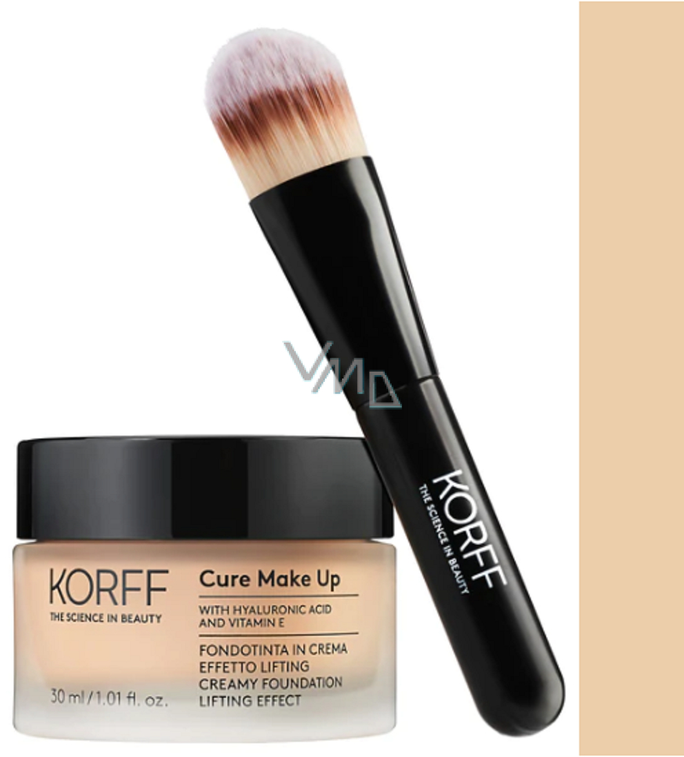Krémový make-up s liftingovým efektem KORFF obsahuje kyselinu hyaluronovou a vitamin E. Díky tomu bude vaše pleť hydratovaná a chráněná před nepříznivými vlivy prostředí. Jeho textura se středně vysokým krytím klouže po pokožce a neshromažďuje se v mikrovráskách. Obsažené aktivní látky zajišťují liftingový efekt. Vyhlazuje drobné vrásky a redukuje mimické linky. Zanechává rozjasněnou, viditelně pevnější a zdravě vypadající pleť. Dodává pokožce saténový finiš. Balení obsahuje praktický štěteček, který umožňuje snadnější roztírání produktu. Díky měkkým syntetickým vláknům je ideální pro přesné a rovnoměrné nanášení.