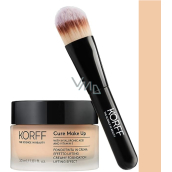 Krémový make-up s liftingovým efektem KORFF obsahuje kyselinu hyaluronovou a vitamin E. Díky tomu bude vaše pleť hydratovaná a chráněná před nepříznivými vlivy prostředí. Jeho textura se středně vysokým krytím klouže po pokožce a neshromažďuje se v mikrovráskách. Obsažené aktivní látky zajišťují liftingový efekt. Vyhlazuje drobné vrásky a redukuje mimické linky. Zanechává rozjasněnou, viditelně pevnější a zdravě vypadající pleť. Dodává pokožce saténový finiš. Balení obsahuje praktický štěteček, který umožňuje snadnější roztírání produktu. Díky měkkým syntetickým vláknům je ideální pro přesné a rovnoměrné nanášení.