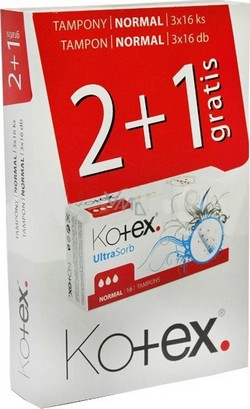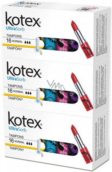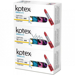 Tampony Kotex Ultrasorb mají speciálně navržené modré absorpční jádro, vyrobené z vysoce absorpčních vláken, které zabrání protečení. Hladký hedvábný povrch a zaoblenou špičku pro snazší zavádění. Unikátní “Twist&open“ systém pro snadné rozbalování tampónu. Jednotlivé tampóny balené do stylových pastelových barev vyjadřujících sebevědomí i v období periody. Varianta UltraSorb Normal tampony pro slabé až střední krvácení.