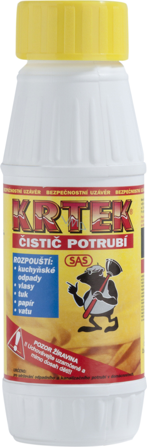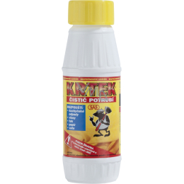 Środek do rur Krtek jest przeznaczony do utrzymywania rur odpływowych i kanalizacyjnych w domach, rozpuszcza odpady kuchenne, włosy, tłuszcz, papier, watę. Nie można go stosować na rurach aluminiowych. Opakowanie jest wyposażone w zabezpieczoną nakrętkę.