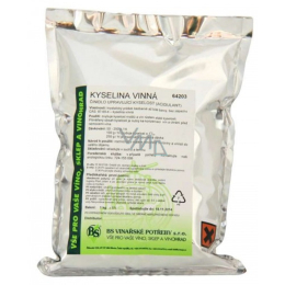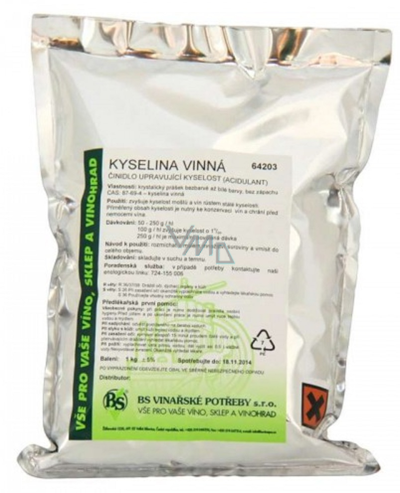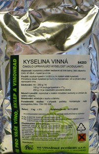 Krystalický prášek bezbarvé až bílé barvy, bez zápachu. Činidlo upravující kyselost. Zvyšuje kyselost moštů a vín růstem stálé kyselosti. Přiměřený obsah kyselosti je nutný ke konzervaci vín a chrání před nemocemi vína.