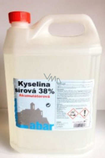 Labar kyselina sírová 38% používaná jako elektrolyt k plnění suchých údržbových olověných akumulátorů, např. autobaterie, motobaterie apod.