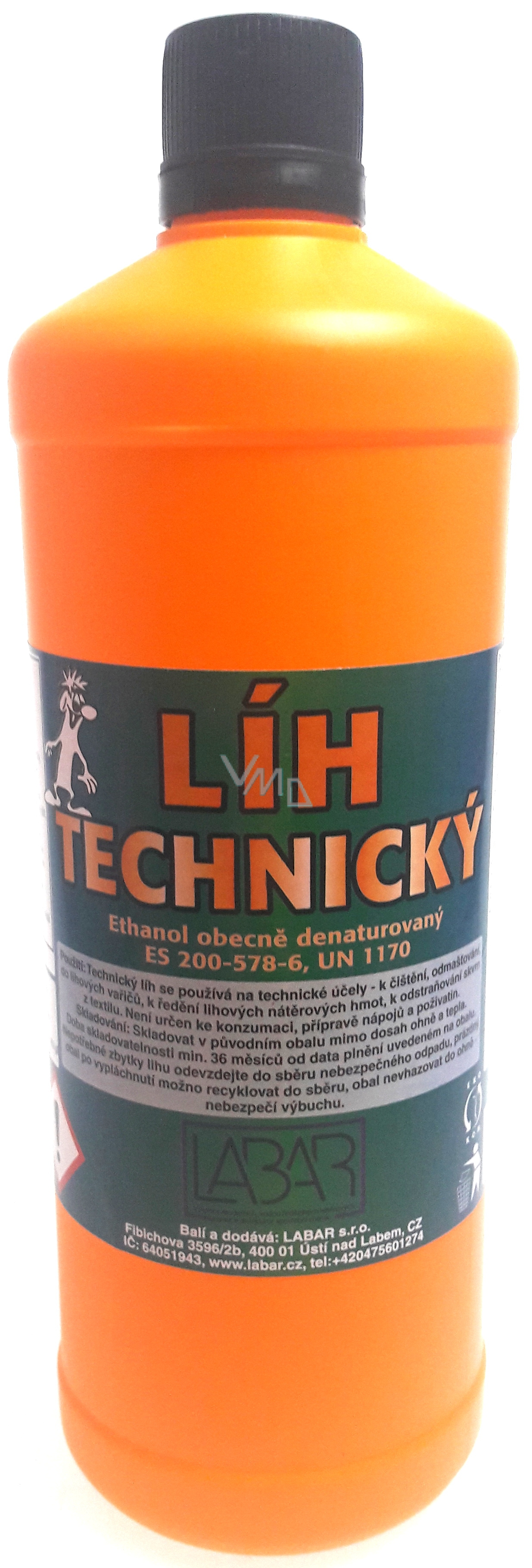 Technický líh - Denaturowany etanol jest używany do celów technicznych - do czyszczenia, odtłuszczania, do urządzeń destylacyjnych, do rozcieńczania alkoholowych substancji, do usuwania plam z tkanin.