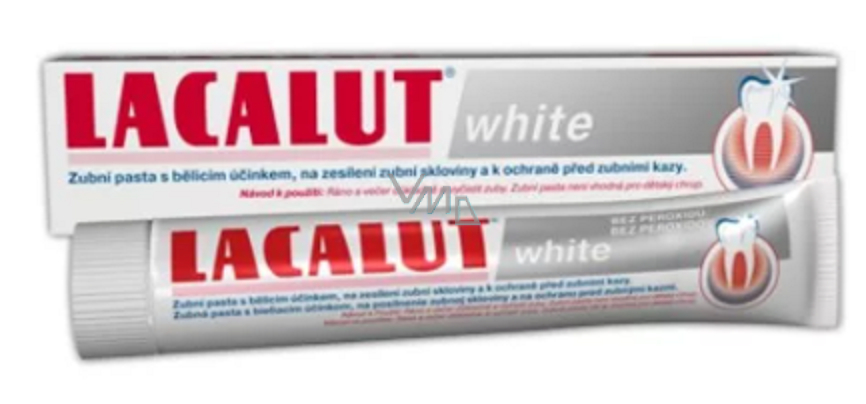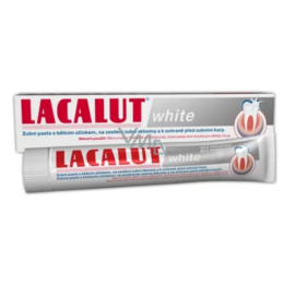 Zubní pasta Lacalut white je určena k šetrnému odstraňování zabarvení zubní skloviny způsobené kouřením nebo stravou. Neobsahuje peroxidy ani cukr. Přítomné fluoridy (1 357 ppm fluoru) zpevňují zubní sklovinu a chrání před vznikem zubního kazu. Aluminium laktát posiluje parodont a zabraňuje krvácení dásní. Pasta není vhodná pro dětský chrup. Konzumací kávy, čaje, červeného vína a kouřením se naše zuby časem zabarvují. Denní používaní Lacalut white Vám pomůže důsledně a šetrně toto zabarvení odstranit. Čisticí složky čistí vaše zuby šetrně. Zubní sklovina je fluoridy zpevňována a zároveň chráněná před zubním kazem. Také vaše dásně jsou zpevněny a jejich případné krvácení se zastaví.