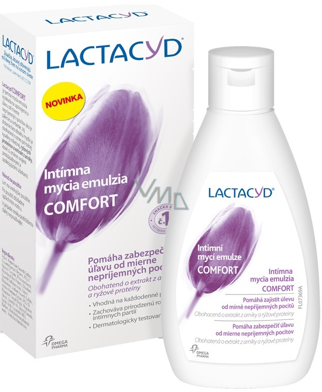 Lactacyd Comfort je jemná mycí emulze, která má díky svému složení zklidňovat a ulevovat při menším diskomfortu, jako jsou pocity pálení a svědění. Neobsahuje mýdlo a je obohacena o směs přírodní kyseliny mléčné, rýžového proteinu a výtažku z arniky, které jsou známé pro protizánětlivé a tišící vlastnosti.