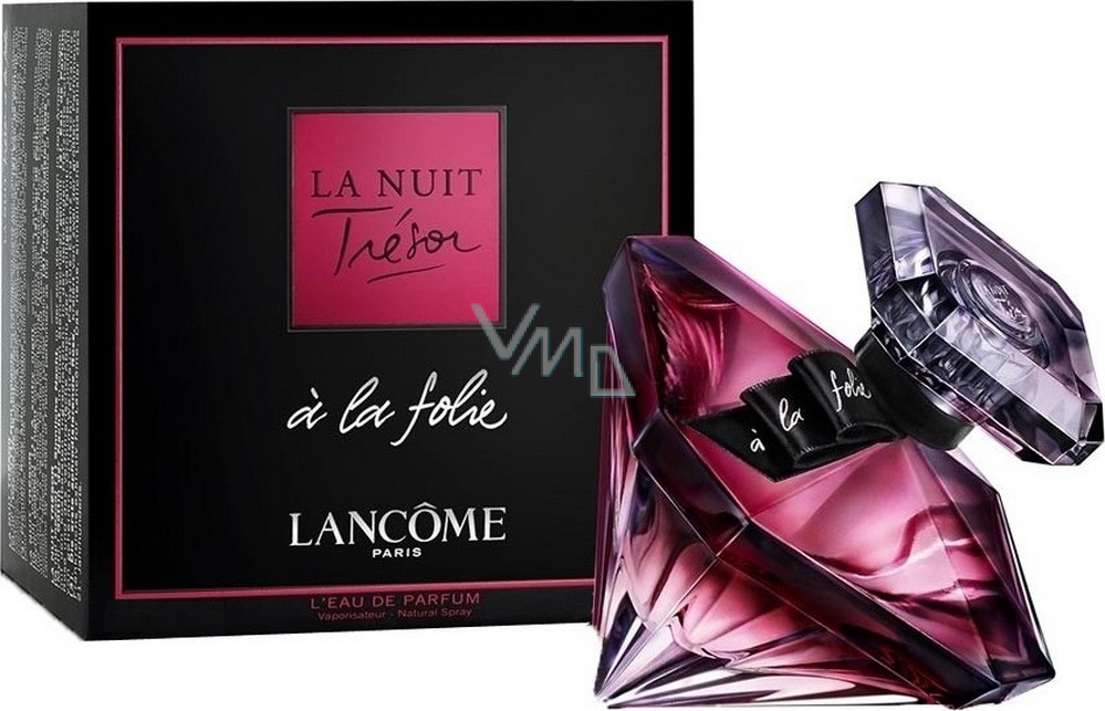 Vůně žhnoucí lásky. Novinka La Nuit Trésor a la Folie vyjadřuje noc plnou spalující lásky, kdy se k sobě milenci zaplaveni absolutní láskou tisknou v pevném objetí. Ten pocit vášnivé lásky při kterém naprosto ztrácíte kontrolu. Akord vanilkového elixíru lásky, tajná přísada této kompozice, vyvolává závrať plnou rozkoší a podtrhuje samotné srdce dřevité květinové vůně.