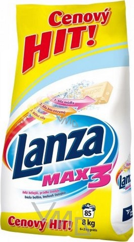 Lanza Max3 je výborným pracím práškem na bílé prádlo, které i po mnoha vypráních bude vypadat skvěle díky síle mýdla, síle bio-enzymů a bělící síle.