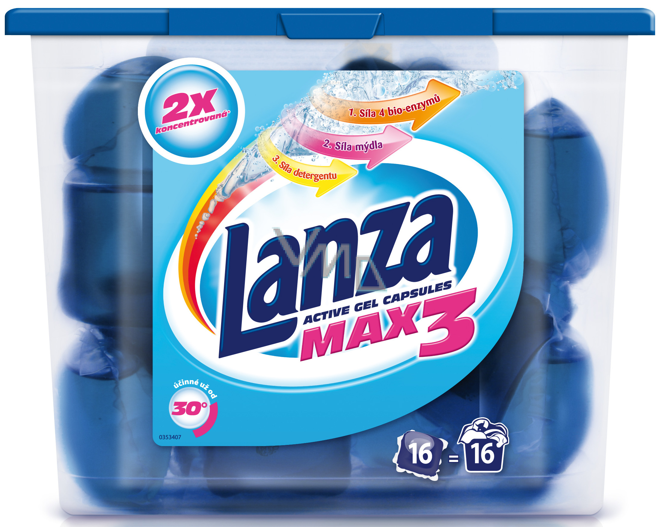 Gelové kapsle Lanza Max3 představují dávkovaný tekutý prací prostředek, který se vkládá přímo do bubnu pračky a je rozpustný ve vodě již při 30°C. Formule Lanza kapsle na barevné prádlo obsahuje aktivní složky, které pomáhají chránit prádlo před obarvením, kapsle na bílé prádlo pak navíc obsahují i optické zjasňovače, díky který bude Vaše prádlo dokonale čisté a bílé.