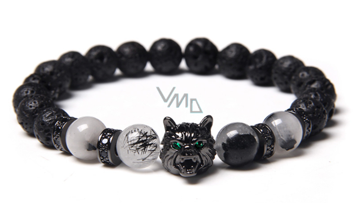 Láva + křišťál + křišťál s turmalínem + Vlčí hlava náramek elastický přírodní kámen, kulička 8 mm / 21 cm