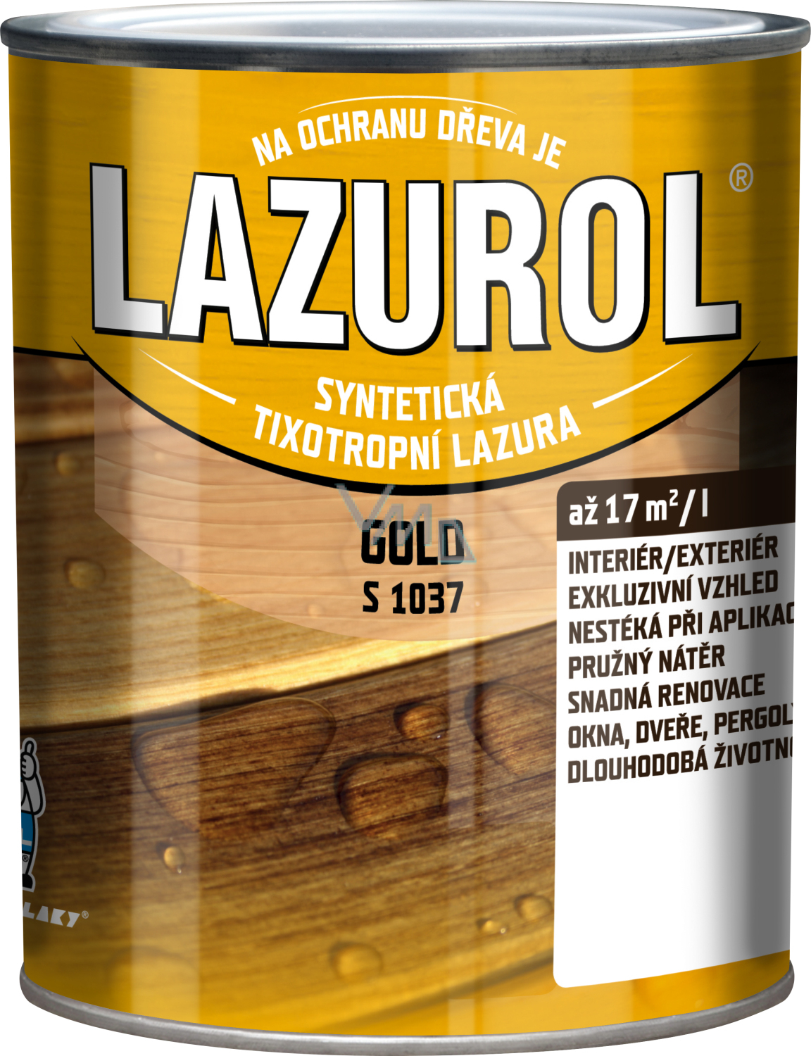 LAZUROL GOLD S1037 lazura na dřevo je určena k dlouhodobým ochranným barevným transparentním nátěrům měkkého i tvrdého dřeva vystaveného povětrnostním vlivům i pro nátěry v interiéru, např. zahradní nábytek, dřevěné štíty, podhledy, obložení stěn a stropů, ploty, chaty a dřevěné domky. Vytváří na povrchu dřeva efektní (dekorativní) ochranný nátěrový film, který zdůrazňuje kresbu dřeva a zároveň dřevo zpevňuje a dlouhodobě chrání před vlhkostí a UV zářením.