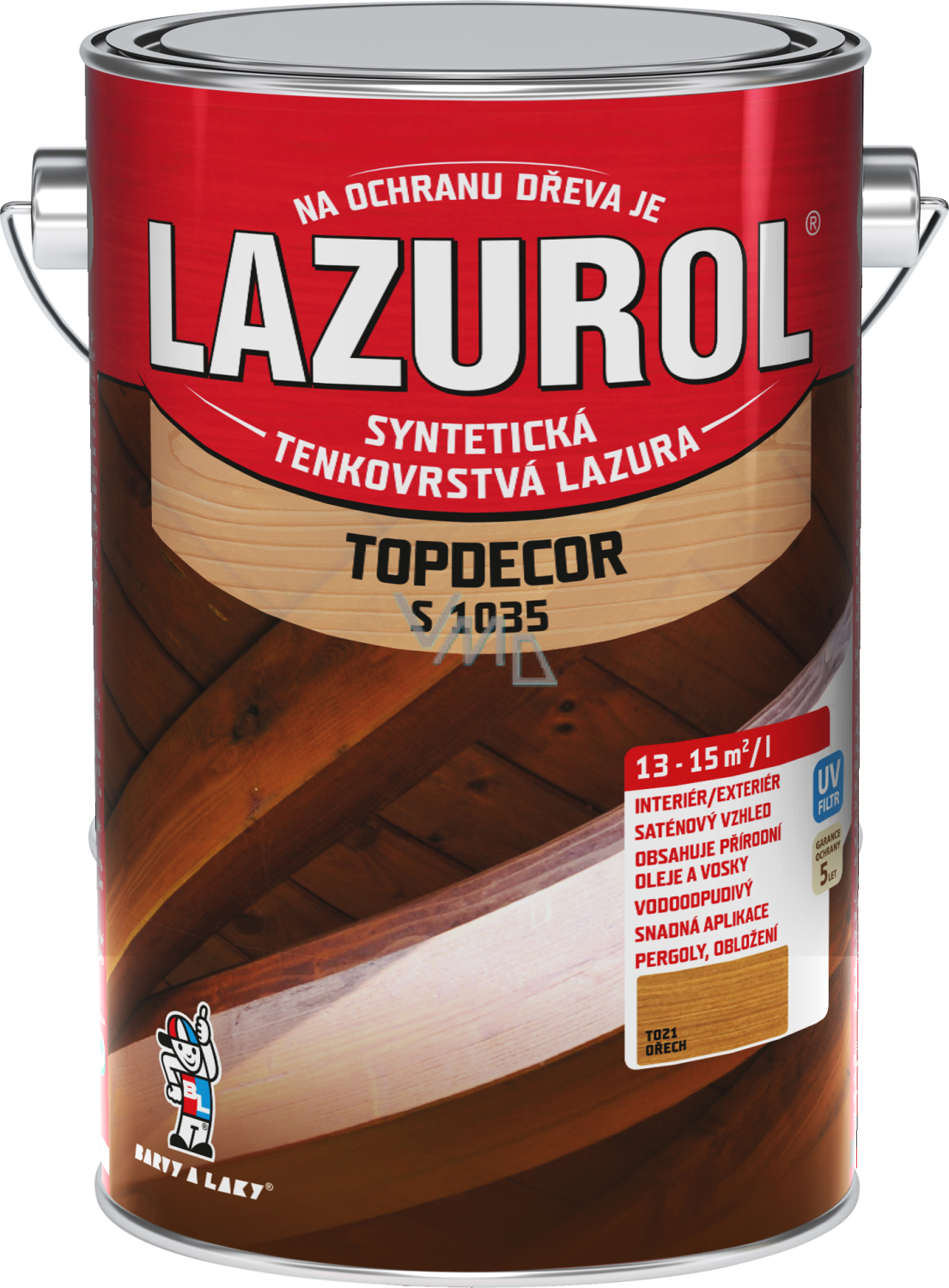 Lazurol Topdecor S1035 tenkovarstwowa lazura do drewna jest przeznaczona do ochronnych lazur na miękkie i twarde drewno, wystawionego na działanie warunków atmosferycznych, jak również do malowania wewnątrz (meble ogrodowe, drewniane szczyty, sufity, obłożenie ścian i sufitów, ogrodzenia, domki letniskowe, okna, drzwi, korek, impregnowanie drewnianych podłóg). Lazura do drewna zawiera wosk, olej naturalny i przezroczyste tlenki żelaza. Głęboko penetruje strukturę drewna i podkreśla jego fakturę. Zapewnia długotrwałą ochronę drewna przed wodą i promieniowaniem UV. Powłoki są odporne na blaknięcie, łatwe do odnowienia i nie pękają. Odcień T000 -naturalny jest przeznaczony wyłącznie do użytku wewnętrznego!!