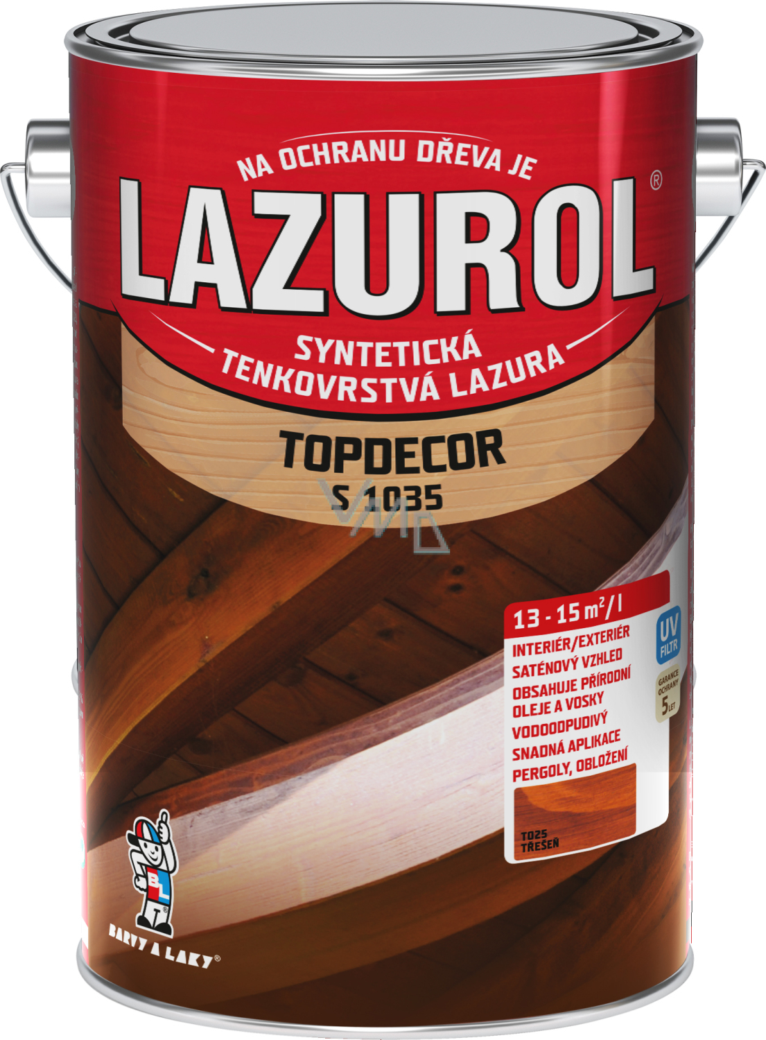 Lazurol Topdecor S1035 cienkowarstwowy impregnat do drewna jest przeznaczony do ochronnych powłok lazurujących zarówno miękkiego, jak i twardego drewna, narażonego na wpływy atmosferyczne, a także do powłok wewnętrznych (meble ogrodowe, drewniane szczyty, sufity, okładziny ścian i sufitów, ogrodzenia, domki letniskowe i drewniane, okna, drzwi, korek, penetracja drewnianych podłóg). Impregnat do drewna zawiera wosk, olej naturalny i przezroczyste tlenki żelaza. Głęboko wnika w strukturę drewna i podkreśla jego teksturę. Zapewnia długotrwałą ochronę drewna przed wodą i promieniowaniem UV. Powłoki są odporne na kolory, łatwe do odnowienia i nie pękają. Odcień T000 - naturalny jest przeznaczony tylko do użytku wewnętrznego!!