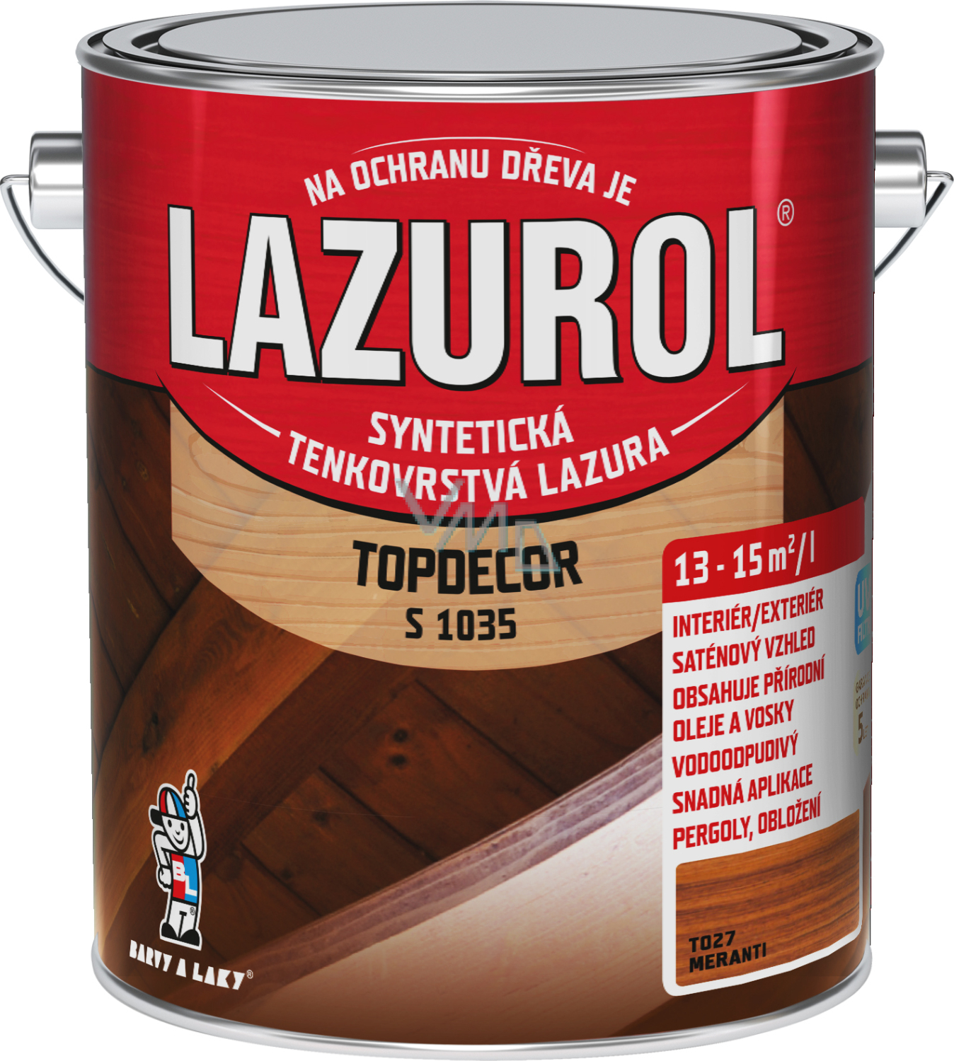 Lazurol Topdecor S1035 tenkovarstwowa lazura do drewna jest przeznaczona do ochronnych lazur do miękkiego i twardego drewna, narażonego na działanie warunków atmosferycznych, jak również do malowania wnętrz (meble ogrodowe, drewniane szczyty, sufity, okładziny ścian i sufitów, płoty, domki letniskowe i drewniane, okna, drzwi, korek, impregnacja drewnianych podłóg). Lazura do drewna zawiera wosk, olej naturalny oraz przezroczyste tlenki żelaza. Głęboko penetrates w strukturę drewna i podkreśla jego teksturę. Zapewnia długotrwałą ochronę drewna przed wodą i promieniowaniem UV. Powłoki są trwałe, łatwe do odnowienia i nie pękają. Odcień T000 - naturalny jest przeznaczony wyłącznie do użytku wewnętrznego!!