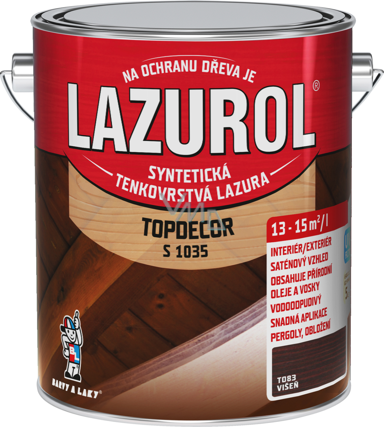 Lazurol Topdecor S1035 tenkowarstwowa lazura na drewno jest przeznaczona do ochronnych lazurujących powłok miękkiego i twardego drewna, wystawionego na działanie warunków atmosferycznych, jak również do powłok wewnętrznych (meble ogrodowe, drewniane osłony, sufity podwieszane, pokrycia ścian i sufitów, ogrodzenia, domki letniskowe, okna, drzwi, korek, penetracja drewnianych podłóg). Lazura na drewno zawiera wosk, olej naturalny oraz przejrzyste tlenki żelaza. Głęboko wnika w strukturę drewna i podkreśla jego rysunek. Zapewnia długoterminową ochronę drewna przed wodą i promieniowaniem UV. Powłoki są odporne na blaknięcie, łatwe do odnowienia i nie pękają. Odcień T000 - naturalny jest przeznaczony wyłącznie do użytku wewnętrznego!!