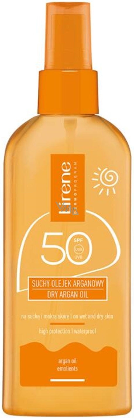 Lirene SUN Suchy olej do opalania dla wilgotnej i suchej skóry SPF 50 jest wodoodporny z wysoką ochroną przed słońcem. Zaawansowany system filtrów fotostabilnych skutecznie chroni skórę przed szkodliwym promieniowaniem UVA i UVB. Olej można stosować zarówno na mokrą, jak i na suchą skórę. Zawiera substancje zmiękczające i olej arganowy, który nawilża skórę.