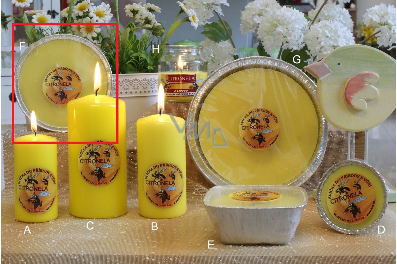 Zahradní žlutá svíčka s citrónovou vůní. Vhodné i pro restaurace a zahradní párty. Svíčka je díky své vůni nazývána citronelou, která se zapaluje ve venkovním prostředí (pergolách) pro odpuzení komárů a jiného otravného hmyzu.