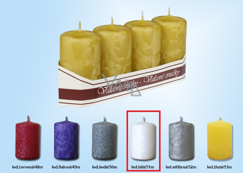 Ledově bílá svíčka ve tvaru válce slouží k běžnému pálení, ale může být i skvělým dárkem. Kvalita hoření je velmi vysoká. Svíčky jsou vyrobeny ze zdravotně nezávadného parafinu vysoké kvality.