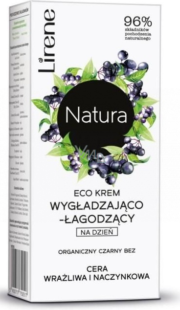 Lirene Natura dzienny łagodzący krem zawiera 96 % składników organicznych i naturalnych, które natychmiast przywracają uczucie komfortu wrażliwej skóry z rozszerzonymi naczyniami. Receptura zapewnia łagodzenie i redukuje zaczerwienienie. Ekstrakt z bzu czarnego pomaga uspokoić i wygładzić skórę oraz zmniejsza przepuszczalność naczyń.