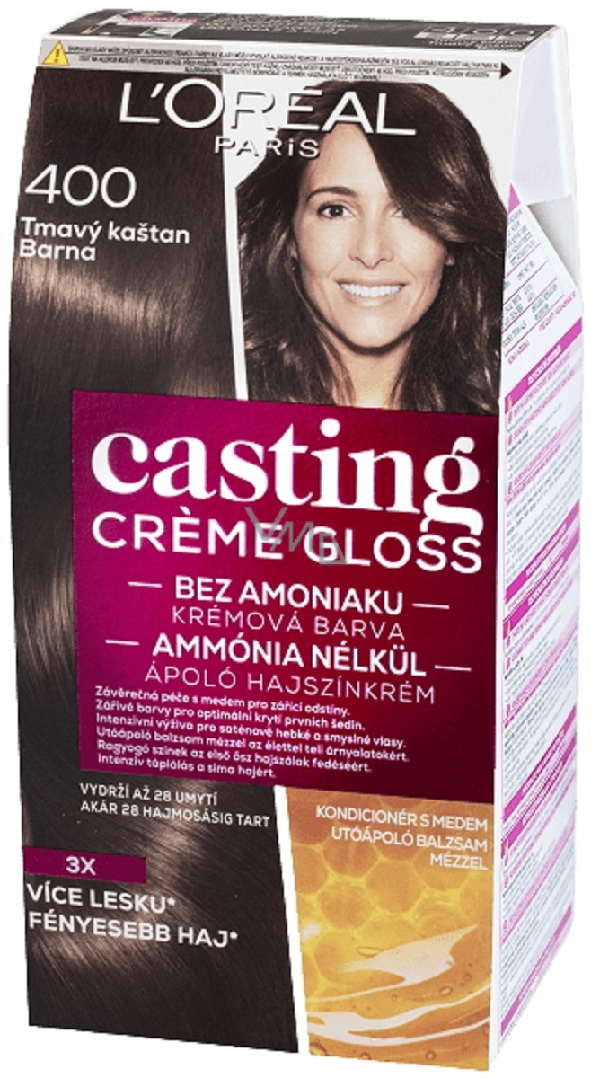 Loreal Paris Farba do włosów Casting Crème Gloss oferuje optymalne pokrycie siwych włosów z wyraźnie błyszczącymi refleksami. Stworzy w twoich włosach błyszczący kolor z jasnymi i widocznymi refleksami, dając bardzo naturalny efekt, który trwa. Skład wzbogacony o mleczko pszczele pozostawia włosy aż 4 razy bardziej błyszczące. Płukanka jest odpowiednia dla wszystkich typów włosów - farbowanych, naturalnych i pasemkowanych.