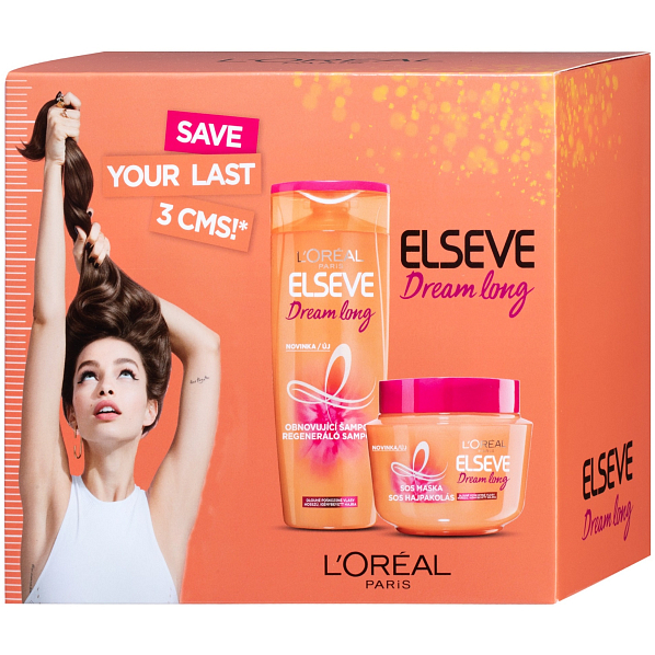 Sada L'Oréal Paris Elseve Dream Long obnovujícího šamponu a regenerační masky na vlasy pro poškozené vlasy. Šampon čistí pokožku hlavy, důkladně myje vlasy a navrací jim přirozenou krásu. Maska na vlasy představuje nenahraditelný krok v péči o vlasy.