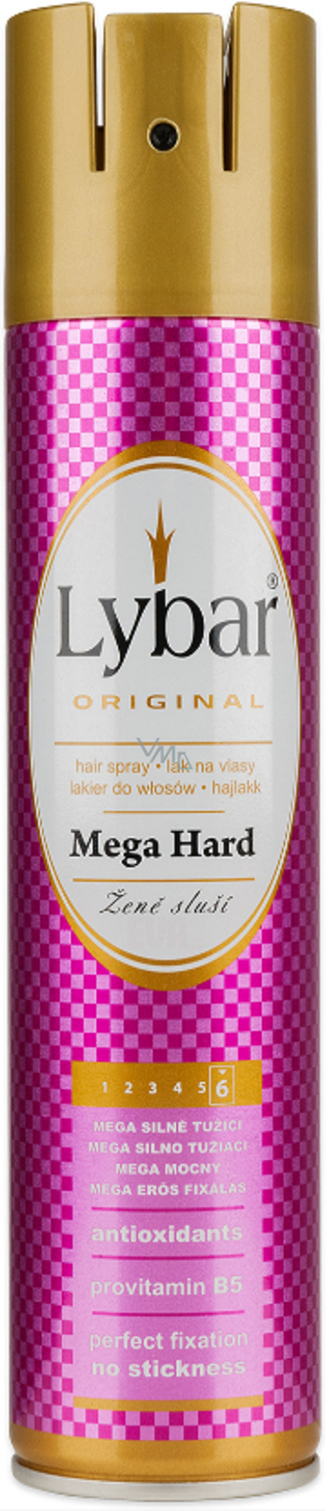 Lakier Lybar Mega Hard ma najsilniejsze działanie utrwalające w całej gamie lakierów marki Lybar. Lakier jest przeznaczony do perfekcyjnego utrwalenia nowoczesnych fryzur, oprócz maksymalnego stopnia utrwalenia zapewnia również 24-godzinny efekt stylizacji, ochronę włosów przed promieniowaniem UV oraz pielęgnację kondycji włosów dzięki zawartemu kompleksowi witaminowemu. Formuła lakieru jest bardzo wysokiej jakości, a jego właściwości utrwalające przewyższają konkurencyjne produkty. Włosy po aplikacji są lśniące i doskonale utrwalone.