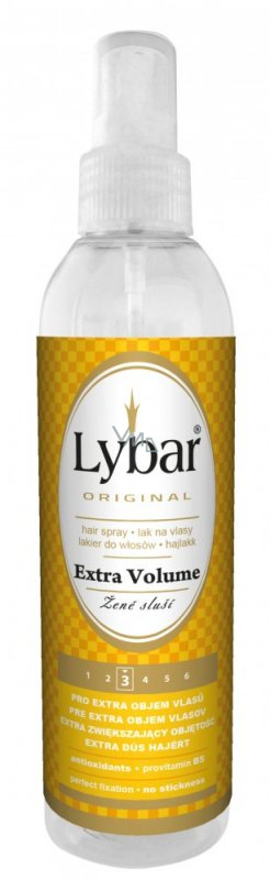 Lak na vlasy se silným účinkem je určen pro všechny typy účesů, kterým dodá maximální objem. Velmi kvalitní rozprašovač s mechanickou pumpou lze opakovaně plnit náhradní náplní lak Lybar pro Objem vlasů. Obsahuje účinné antioxidanty a UV filtry. Dokonale chrání vlasy před větrem a vlhkostí. Snadno se vyčesává a vymývá.