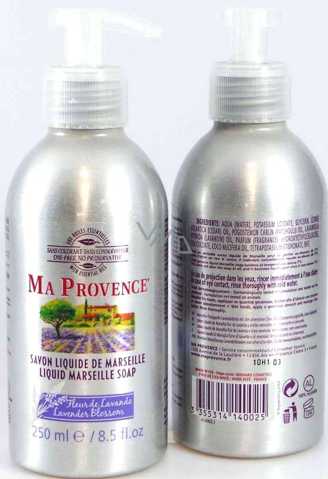 MA PROVENCE® Pravé tekuté mýdlo Marseille s esencí levandulových květů. Pro dokonalou hygienu jsme spojili klasické Marseille a slavnou provensálskou vůni levandule. Mýdlo je vyhledáváno pro své přírodní vlastnosti a čistotu levandule. Levandule, která je vyhledávaná pro své čistící ctnosti, vás díky své upřímné a povzbuzující vůni přenese do srdce Provence.