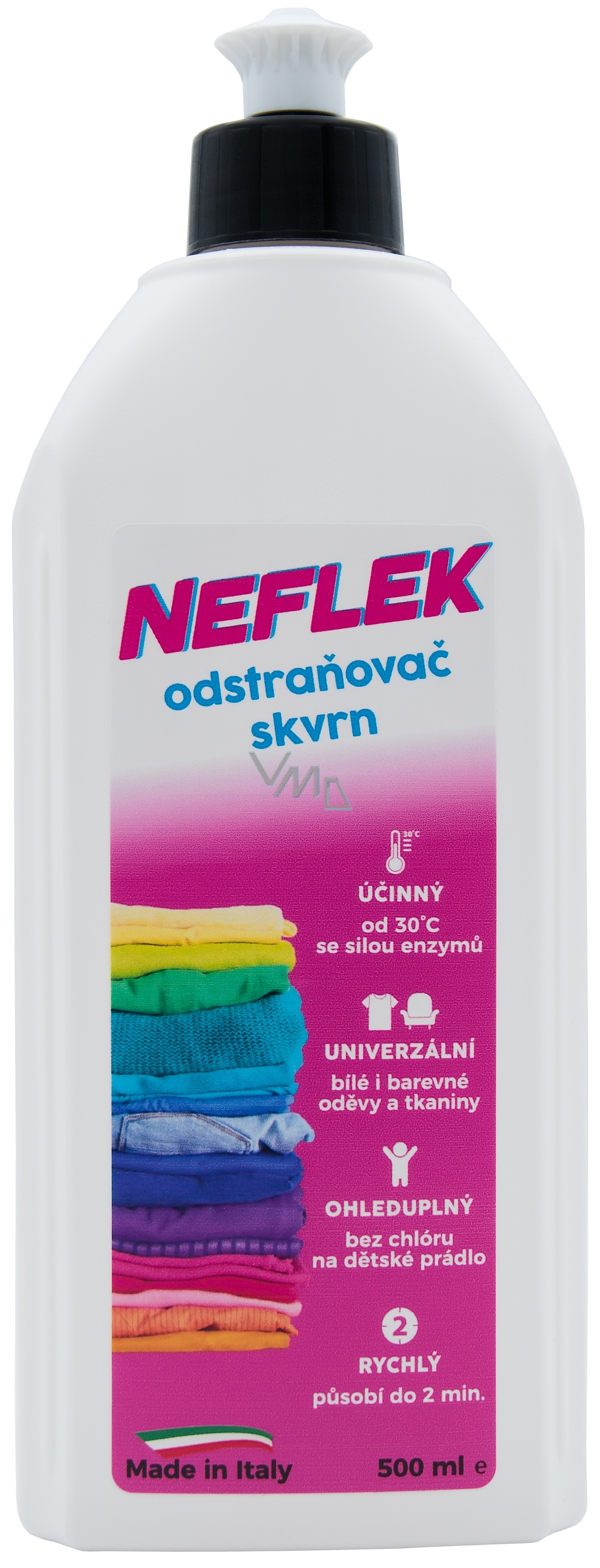 Plamy na praniu już nie są żadnym problemem. Enzymatyczny płynny środek czyszczący Neflek pomoże Wam w usuwaniu wszelkich plam po długopisie, czekoladzie, ketchupie, owocowych dżemach, tuszu, szmince lub zaschniętej krwi z białego i kolorowego prania. W przypadku kolorowego tekstylu i delikatnych tkanin sprawdź odporność tkaniny i jej kolor w małym, ukrytym miejscu - np. na brzegu.