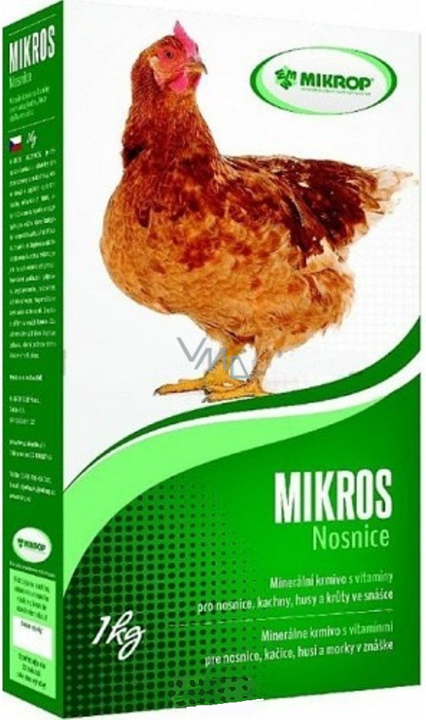 Mikros Nosnice (VDN) je doplňkové minerální krmivo pro nosnice, kachny, husy a krůty ve snášce. Je určeno k doplnění krmných dávek.