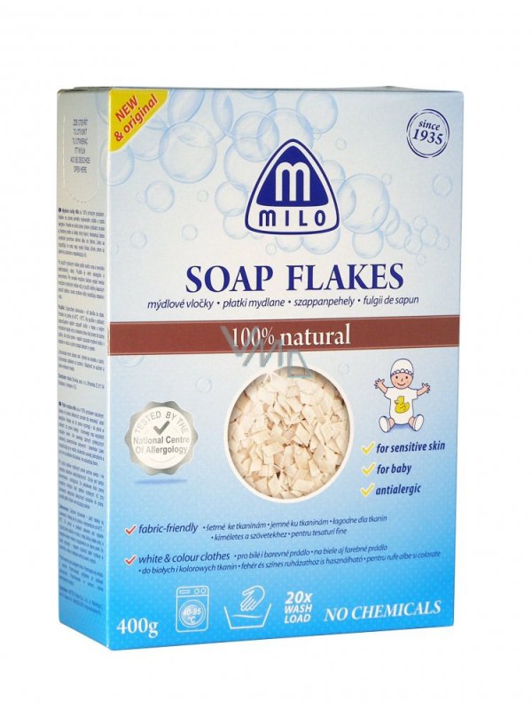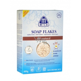 Mýdlové vločky Milo - 100% přírodní produkt. Ideální pro praní jemného kojeneckého prádla a prádla alergiků. Vhodné pro ruční praní i praní v pračkách, pro bílé i barevné prádlo a všechny druhy tkanin.