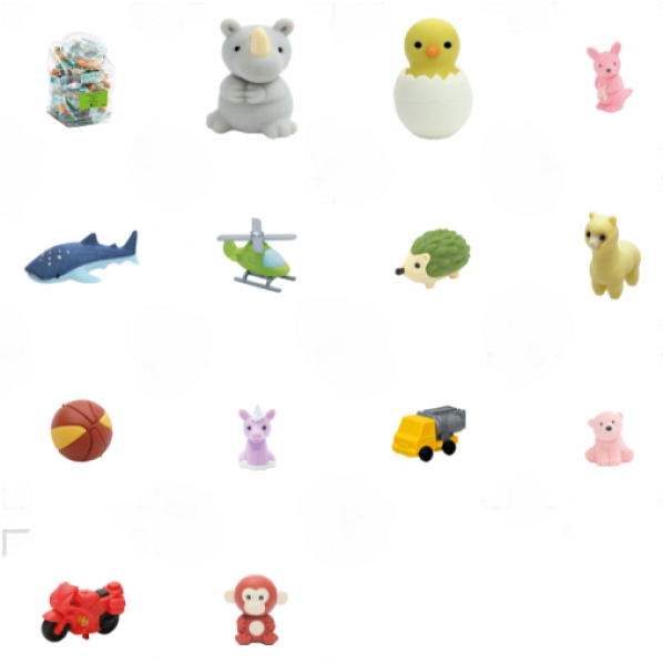Zabawne gumki w stylu puzzle z motywami zwierzątek, auteczek i różnych figurek. Kolorowe postaci mają oddzielne części, dlatego możecie składać je jak 3D puzzle i różnie łączyć z innymi. Od teraz gumowanie w szkole będzie zabawą. Wyprodukowano w Japonii - wysokiej jakości materiał, zdrowotnie nieszkodliwy. Opakowanie: 1 szt./ blistr, łącznie 20 rodzajów x 5 szt./wyświetlacz.