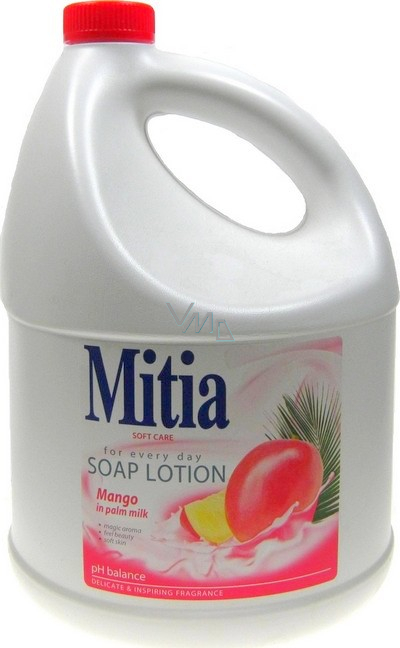 Mitia krémové mýdlo Mango in palm milk je ta nejlepší péče o Vaši pokožku. Dopřejte si kvalitní každodenní péči pro vaši pokožku a vyberte si ze široké nabídky tekutých mýdel Mitia. Jejich jemné krémové složení vyživuje a zvláčňuje pokožku. Tekutá mýdla Mitia jsou navíc obohacena řadou přísad, které z každodenní hygieny udělají příjemný zážitek.