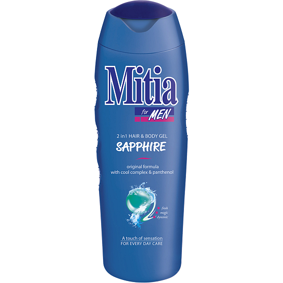 Mitia Sapphire dla mężczyzn żel pod prysznic i szampon 2w1, to codzienne uczucie maksymalnej świeżości i czystości. Zawiera specjalny „cool complex” z działaniem chłodzącym, a dzięki świeżemu zapachowi i bogatej pianie, branie prysznica staje się prawdziwą przyjemnością. Twoja skóra potrzebuje codziennej delikatnej pielęgnacji. Pozwól sobie na rozpieszczanie w różnorodnej gamie żeli pod prysznic Mitia. Ich delikatna kremowa formuła zapewnia, że po każdym prysznicu poczujesz się lepiej.