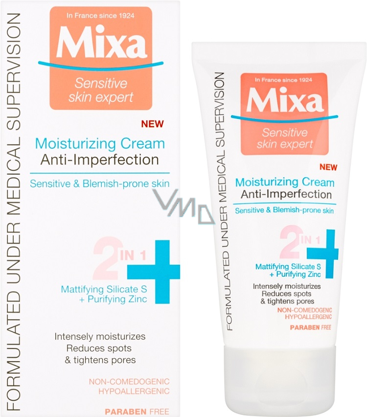 Aplikujte 2x denně na vyčištěnou pleť výrobky z řady Mixa Anti-imperfection. Vyhněte se oblasti kolem očí.