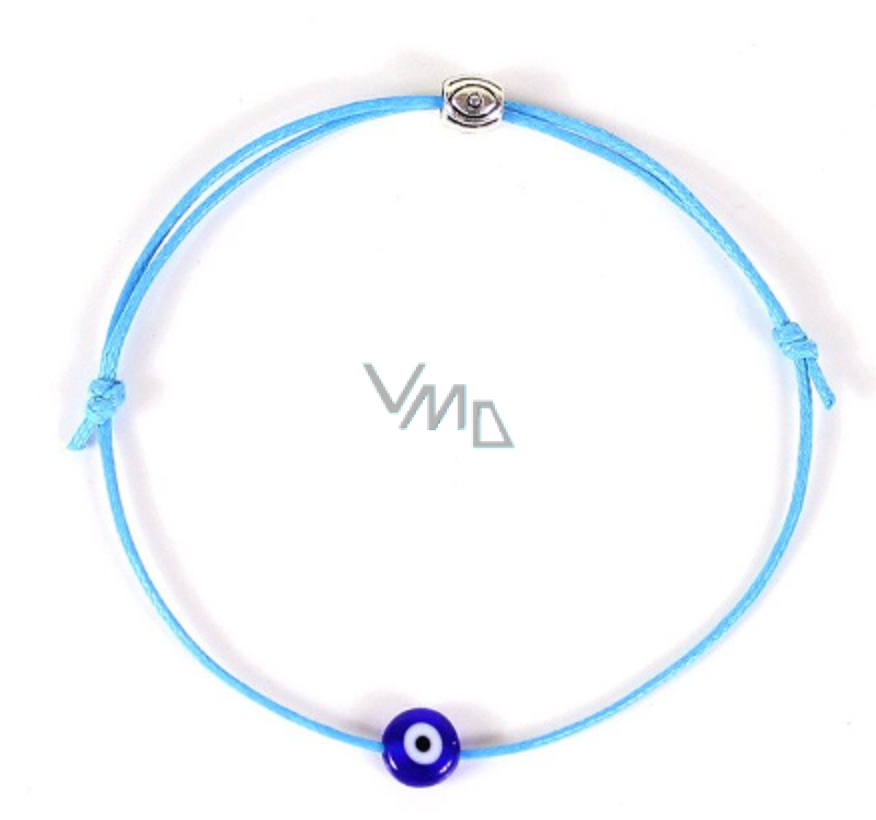 Niebieskie oko bransoletka sznurkowa tkana jasnoniebieska, komponent w kolorze brązowym