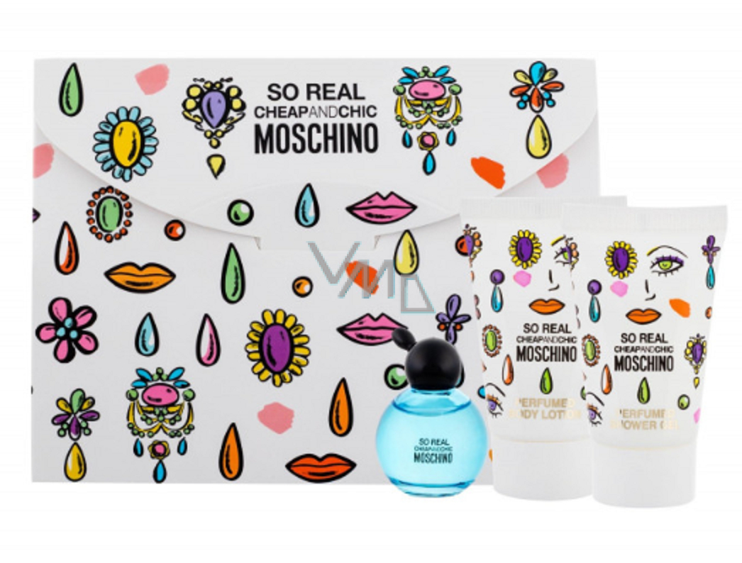 Moschino So Real Cheap and Chic toaletní voda pro ženy 4,9 ml + sprchový gel 25 ml + tělové mléko 25 ml, dárková sada