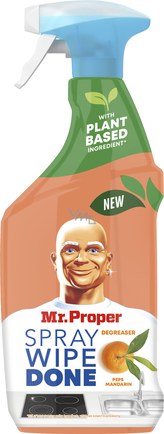 Spray Mr. Proper Wipe Done o zapachu mandarynki jest idealnym partnerem do czyszczenia powierzchni w kuchni. Zostawia świeży cytrusowy zapach mandarynek i z łatwością usuwa tłuszcz i brud. Powierzchnie po zastosowaniu pozostają pachnące i błyszczące, a dzięki roślinnym składnikom jest łagodny tam, gdzie ma kontakt z żywnością.