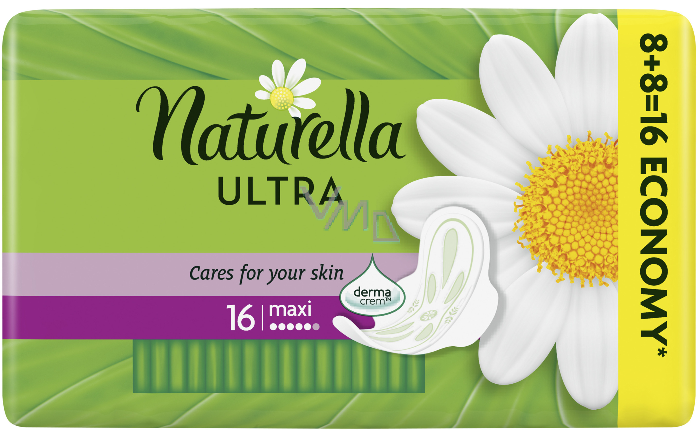 Dámské hygienické vložky Naturella Ultra Maxi 16 ks s příjemnou vůní heřmánku vám během menstruace poskytnou dokonalou ochranu a péči. Vložky mají jedinečný absorpční systém s kanálky a super absorpční vlákna, která tekutinu rozvádí po celé ploše vložky. Zklidňující krém Dermacrem vytvoří na pokožce tenoučkou ochrannou vrstvu, díky které jste chráněné před podrážděním. Tento ochranný krém je nanesen na povrch vložek, odkud se při používání dostane na pokožku. Pro pocit čistoty a svěžesti 365 dní v roce.