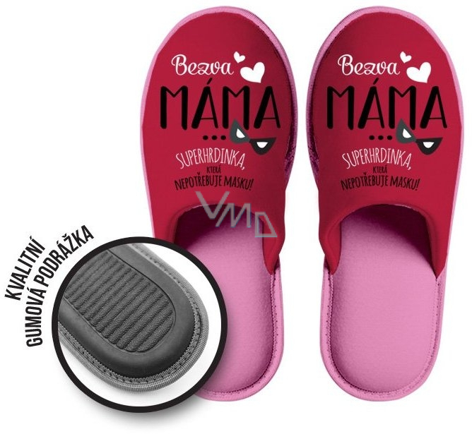 Szukasz oryginalnego prezentu dla mamy? Kup jejdrogie kapcie z zabawnym tekstem "Bezva mama... superbohaterka, która nie potrzebuje maski!". Kapcie są wykonane z miękkiego i wygodnego materiału z wysokiej jakości gumową podeszwą i są idealne do domowego relaksu.